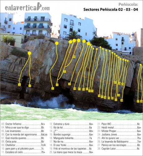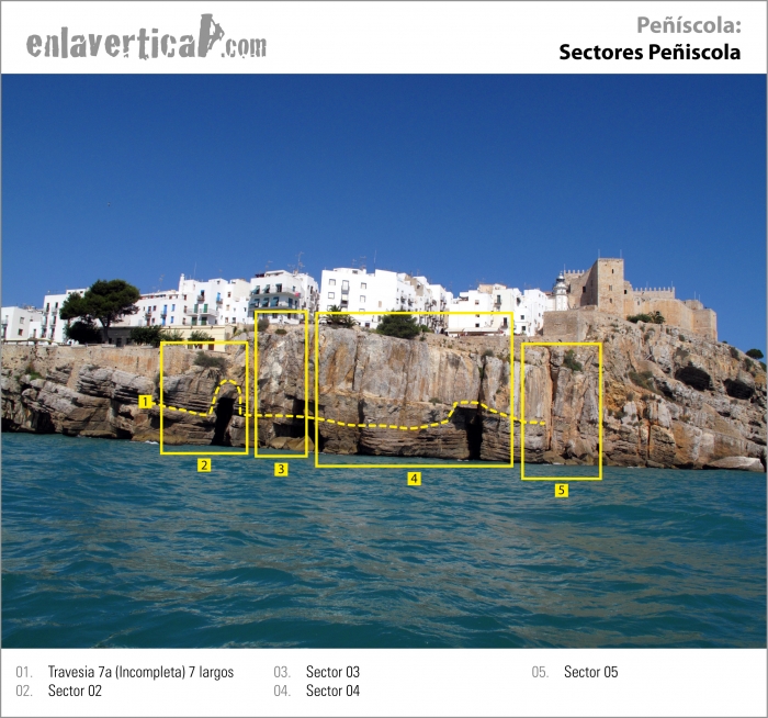Las vías se localizan en una parte de los acantilados de la península del casco antiguo de Peñíscola. Bordeando las calles que dan al mar, hay que asomarse a los acantilados para encontrar los anclajes situados al borde de los mismos. Habrá que descolgarse de ellos y asegurar en los grandes bloques que hay sobre el mar.