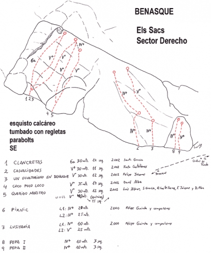 Es la escuela de escalada más cercana al pueblo de Benasque, situada frente al desvío que sube a Cerler, al otro lado del río Ésera.