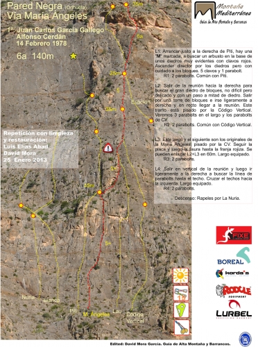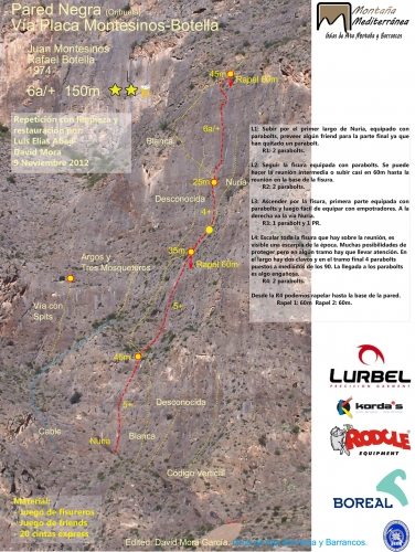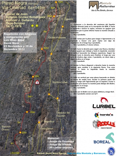 En la Pared Negra podemos encontrar alrededor de 30 itinerarios de características muy similares, con una dificultad moderada (en torno al V/6a) debido a la ligera inclinación que ofrecen sus placas, que rara vez alcanzan los 90º.