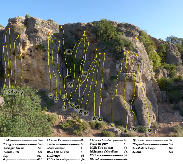 Las vías suelen ser cortas, rara vez superan los 20 metros de altura y en los sectores principales el grado es bastante asequible, lo que hará que siempre nos vayamos con un buen sabor de boca; sobretodo si antes de irnos pasamos a picar algo por el restaurante que se encuentra al comienzo del camino de acceso.