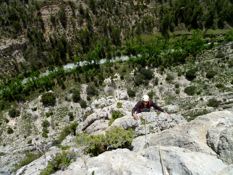 La vía originalmente comienza a la derecha de la linea de parabolts de la vía Teruel existe pero parece que actualmente se le está entrando por estos parabolts, por un tramo vertical sobre romos bastante interesante. Al llegar a la repisa abandonaremos los parabolts para seguir unos metros a su derecha a buscar la primera reunión en un árbol.