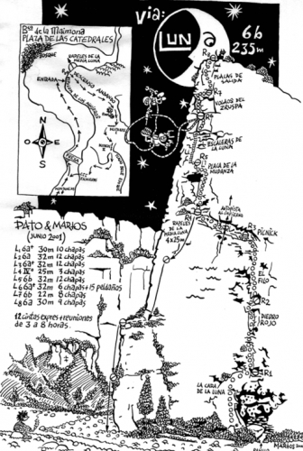 Comienza superando un desplome con canto generoso y sigue por una placa fina. El último tramo del largo discurre con marcada tendencia a la izquierda con pasos largos y técnicos.