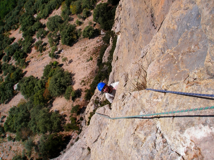 Salimos hacia la derecha por una placa preciosa, seguiremos un fisura que nos sitúa justo en un pequeño desplome (paso protegido por un spit y un clavo), una vez superado saldremos hacia la izquierda por una placa (existe un puente de roca) para luego ir a derechas.