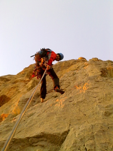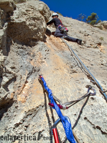 Este largo discurre hacia la izquierda a buscar la continuación del diedro. A pesar de ser sencillo no tiene desperdicio. La reunión se encuentra en un balcón muy cómodo con dos parabolts con argollas.