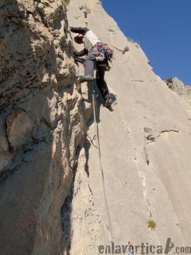 Evidente diedro que transcurre a lo largo de una fisura. La reunión (cómoda) se encuentra a la mitad del diedro. Con una cuerda de 60m. podremos continuar hasta la siguiente reunión sin detenernos.