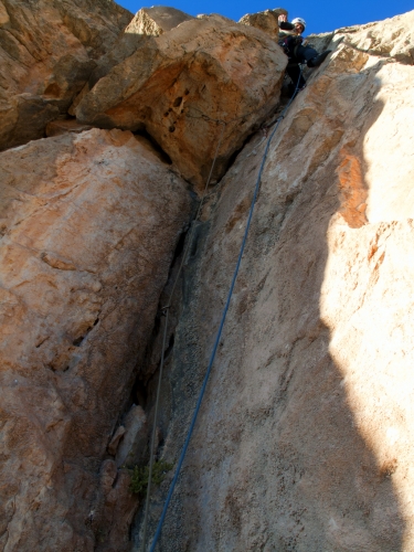 Este último largo discurre por una fisura con mucho canto. Antes de la sección clave (diedro + techo) del largo encontraremos una antigua reunión con dos clavos donde se puede hacer una reunión intermedia (protegiéndola debidamente) y ver al compañero mientras realiza el paso clave de la vía: un techo que sortearemos por la derecha siguiendo la fisura/diedro evidente hasta llegar a la última reunión y descuelgue, donde encontraremos variedad de cintas antiguas rodeando una arista.